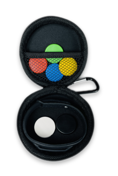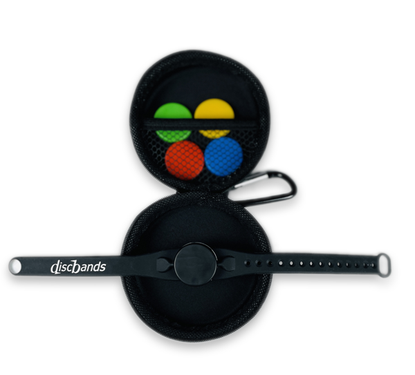 The Discbands Bundle contains the Alternate Possession Wristband Starter, Color Pack containing the most commonly used team jersey colors, and the 10 cm * 10 cm * 4 cm EVA Storage Case with attached carabiner.