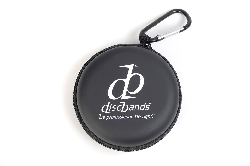 Disc bands EVA Storage Case (10 cm * 10 cm * 4 cm) with black zipper. Easily stores away or attaches to your gym bag with a black carabiner.