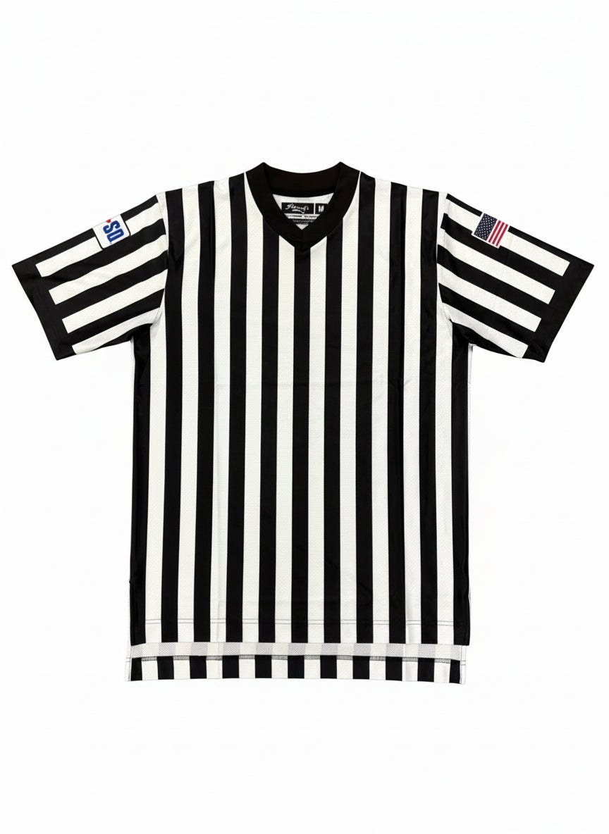 The Honig's TASO Pro-Stretch Basketball Officials Jersey delivers superior comfort and mobility for game day. Engineered with a 95% polyester and 5% spandex blend, the Pro-Stretch fabric moves with you through every call and positioning change. Features the official TASO logo on the right sleeve with white border USA flag on the left sleeve. Built for officials who demand performance and durability. Available in sizes Extra Small through 4XL in men's cut only.